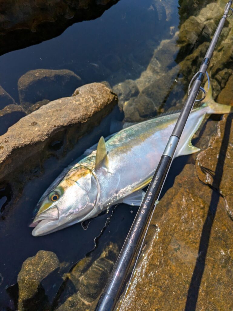 このヒラマサは潮がなかなか入ってこないように見えている時に、底潮は動いてないかな?ってジグを沈めたら釣れた1本です。まずプラグが届く範囲で潮を探すも見つからず、フルキャストして潮が効いてそうなところをみつけて、立ち位置を変えながら潮にハマる角度を探してたら着底から2シャクリ目でヒット。4キロ級でしたがめちゃめちゃ遠くのボトムで掛けたので疲れ果てました笑