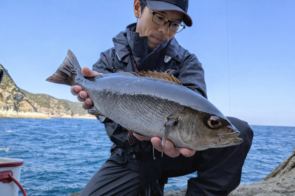 最後にわずかに流れてるのにアタリが出ないのでさらに深く入れていくと今日一の走り。良型オナガだと信じて上げてきたら良型のイサキでした。